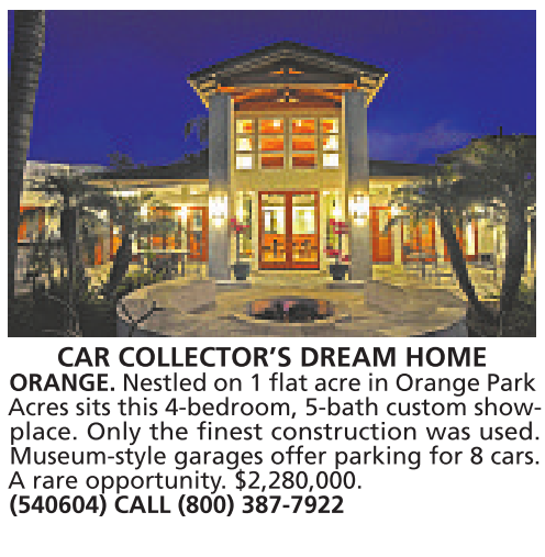 CAR COLLECTOR’S DREAM HOME ORANGE. Nestled on 1flat acre in Orange Park Acres sits this 4-bedroom, 5-bath custom showplace. Only the finest construction was used. Museum-style garages offer parking for 8 cars. A rare opportunity. $2,280,000. (540604) CALL (800) 387-7922
