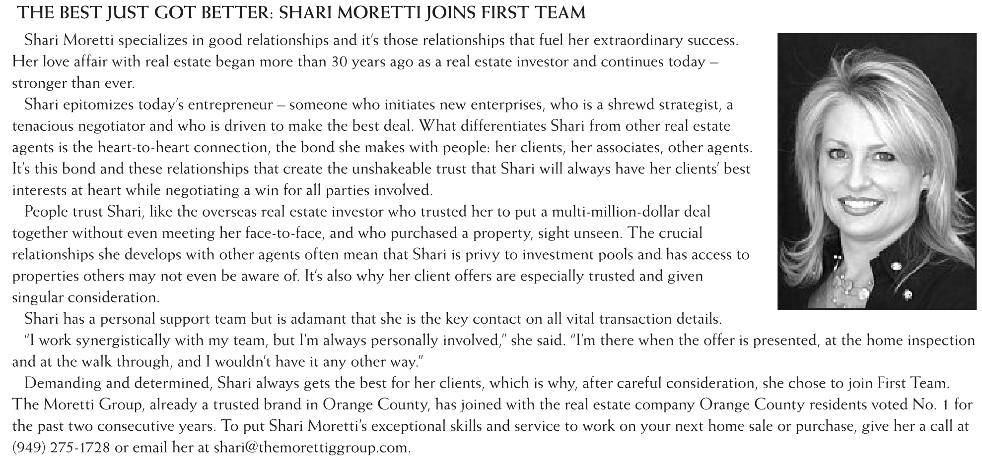 The Moretti Group, already a trusted brand in Orange County, has joined with the real estate company Orange County residents voted No. 1 for the past two consecutive years. To put Shari Moretti’s exceptional skills and service to work on your next home sale or purchase, give her a call at (949) 275-1728 or email her at shari@themorettiggroup.com.