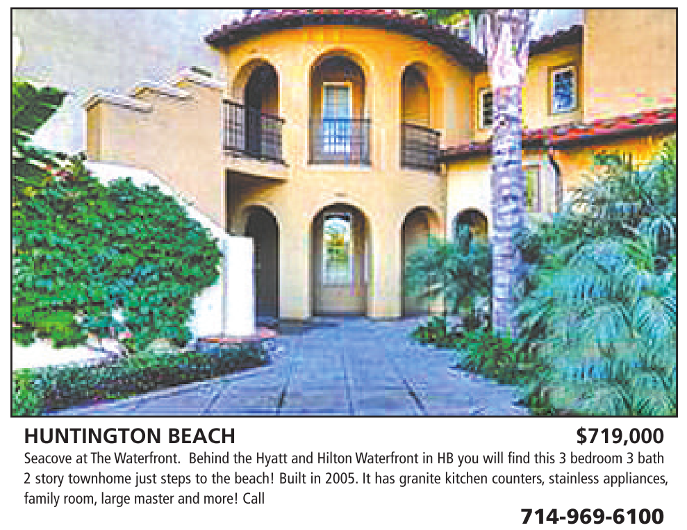 HUNTINGTON BEACH $719,000 Seacove at TheWaterfront. Behind the Hyatt and Hilton Waterfront in HB you will find this 3 bedroom 3 bath 2 story townhome just steps to the beach! Built in 2005. It has granite kitchen counters,stainless appliances, family room, large master and more! Call 714-969-6100