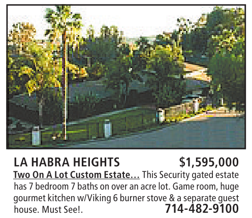 LA HABRA HEIGHTS $1,595,000 TwoOnALot Custom Estate… This Securitygated estate has7bedroom 7baths on overanacrelot.Gameroom, huge gourmet kitchen w/Viking 6burnerstove &aseparateguest house.MustSee!. 714-482-9100