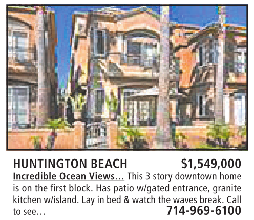 HUNTINGTON BEACH $1,549,000 Incredible Ocean Views… This 3story downtown home is on the first block. Has patio w/gated entrance, granite kitchen w/island.Lay in bed &watchthe wavesbreak.Call to see… 714-969-6100