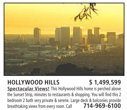 HOLLYWOOD HILLS $ 1,499,599 Spectacular Views! This Hollywood Hills home is perched above the Sunset Strip, minutes torestaurants &shopping. You will find this 2 bedroom 2bath very private &serene. Large deck &balconies provide breathtakingviews from everyroom. Call 714-969-6100
