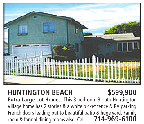 HUNTINGTON BEACH $599,900 Extra Large Lot Home…This 3bedroom 3bath Huntington Village home has 2stories &awhite picket fence &RVparking. French doors leading out to beautifulpatio &hugeyard. Family room &formal diningrooms also. Call 714-969-6100