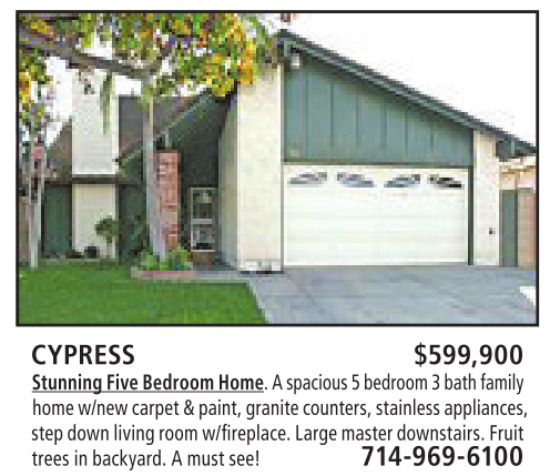 CYPRESS $599,900 StunningFiveBedroom Home.Aspacious 5bedroom3bathfamily homew/new carpet &paint, granite counters, stainlessappliances, stepdownliving room w/fireplace.Large masterdownstairs. Fruit treesinbackyard. Amustsee! 714-969-6100