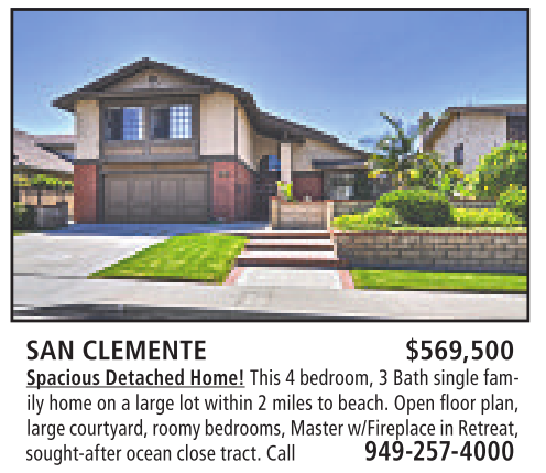 SAN CLEMENTE $569,500 Spacious Detached Home! This 4bedroom, 3Bathsinglefamily home on alarge lot within 2miles to beach. Open floor plan, largecourtyard, roomybedrooms,Masterw/Fireplace in Retreat, sought-afteroceanclose tract. Call 949-257-4000