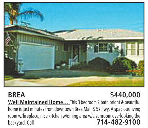 BREA $440,000 Well Maintained Home… This 3bedroom2bathbright&beautiful home is just minutes from downtown Brea Mall &57Fwy.Aspacious living room w/fireplace,nicekitchen w/diningareaw/a sunroomoverlooking the backyard. Call 714-482-9100