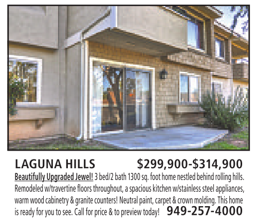 LAGUNA HILLS $299,900-$314,900 BeautifullyUpgradedJewel! 3bed/2 bath 1300 sq. foot home nestledbehindrolling hills. Remodeledw/travertinefloors throughout,aspacious kitchen w/stainlesssteel appliances, warm wood cabinetry&granite counters!Neutral paint,carpet&crown molding.This home is readyfor youtosee.Callfor price &topreview today! 949-257-4000