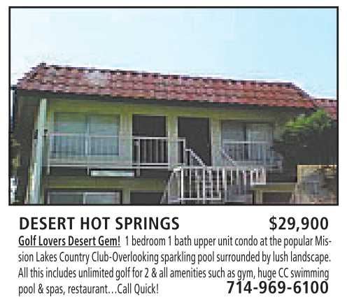 DESERT HOT SPRINGS $29,900 Golf Lovers DesertGem! 1bedroom1bathupper unit condoatthe popular Mission LakesCountryClub-Overlooking sparklingpoolsurrounded by lush landscape.