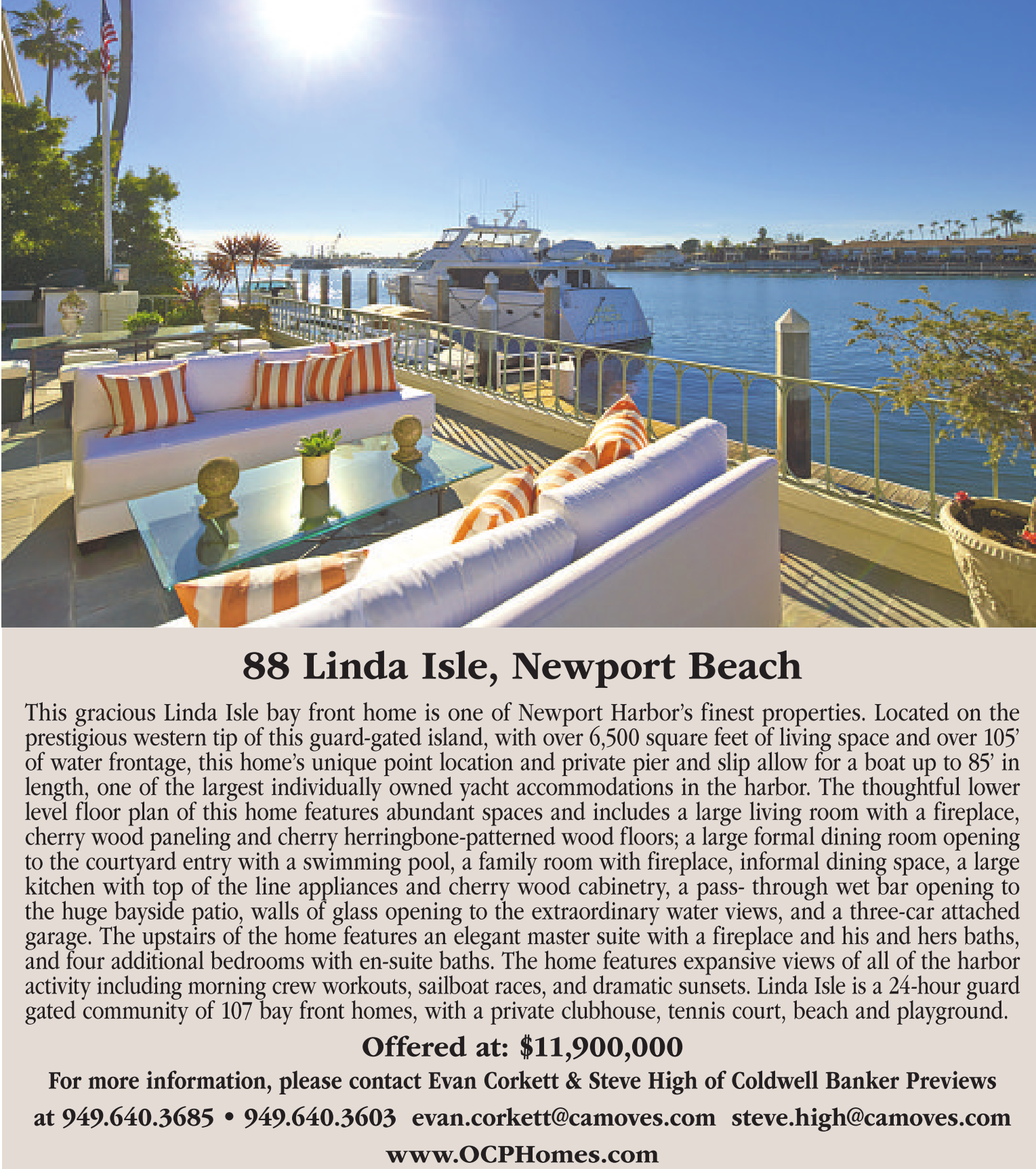 prestigious western tip of this guard-gated island, with over 6,500 square feet of living space and over 105’ of water frontage, this home’s unique point location and private pier and slip allow for a boat up to 85’ in length, one of the largest individually owned yacht accommodations in the harbor. The thoughtful lower
