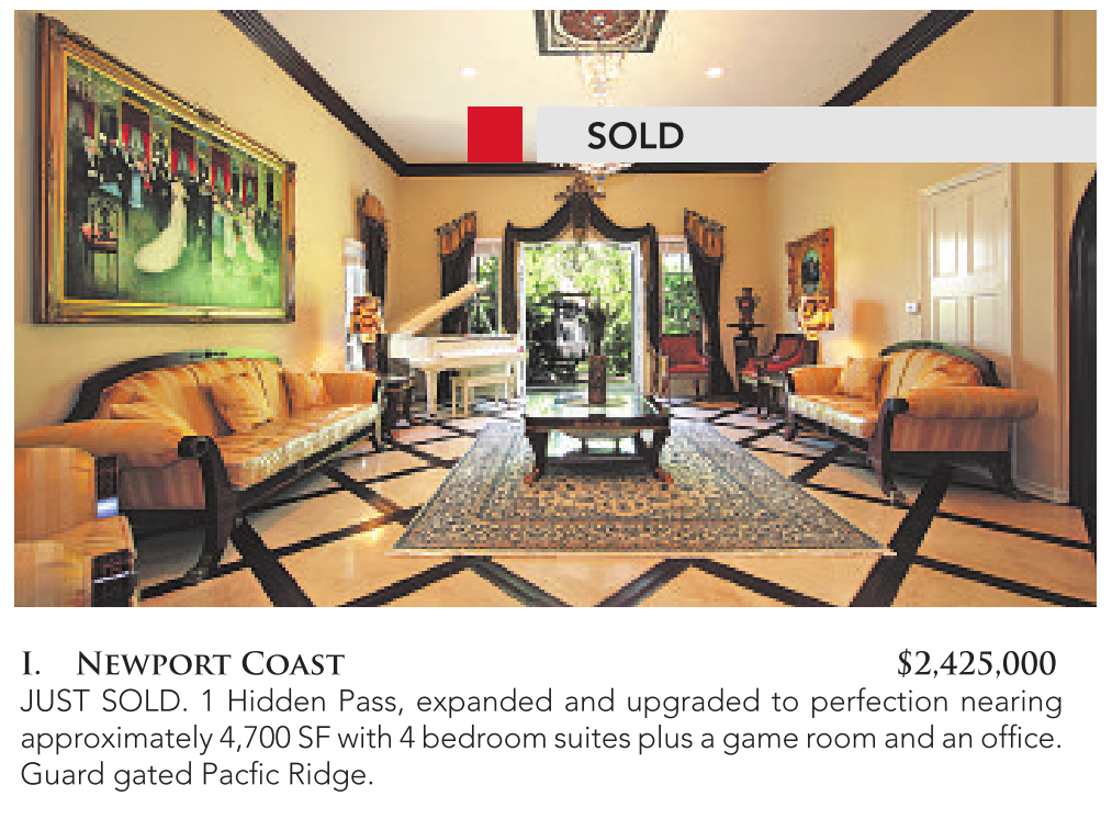 I. Newport Coast $2,425,000 JUST SOLD. 1 Hidden Pass, expanded and upgraded to perfection nearing approximately 4,700 SF with 4 bedroom suites plus a game room and an office. Guard gated Pacfic Ridge.