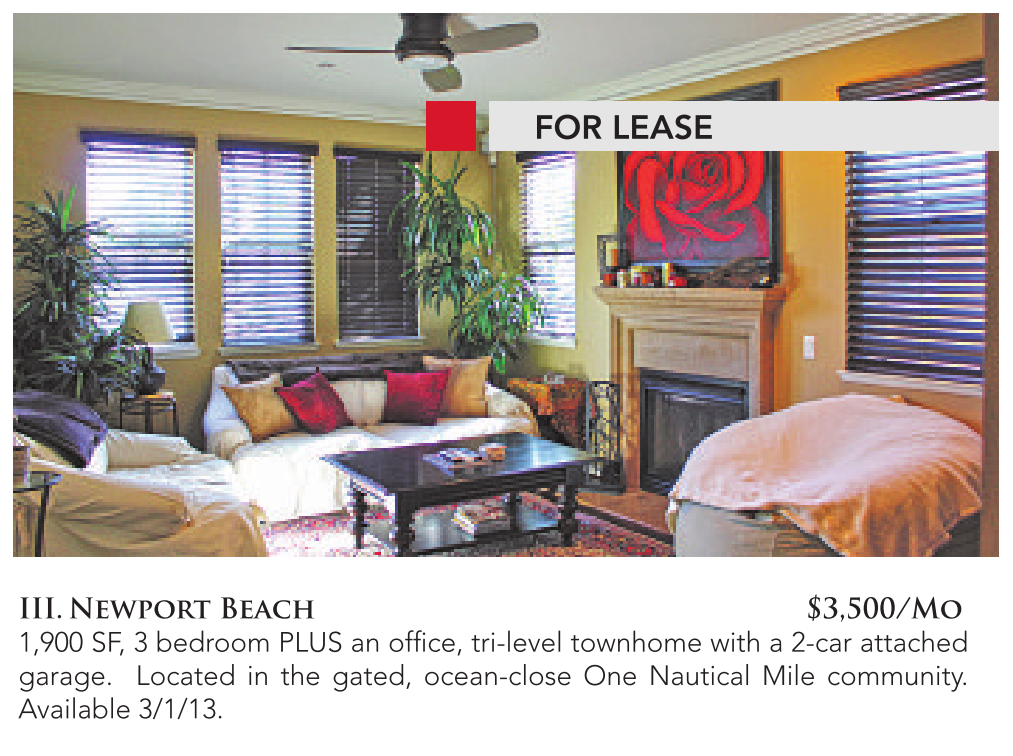 III. Newport Beach $3,500/Mo 1,900 SF, 3 bedroom PLUS an office, tri-level townhome with a 2-car attached garage. Located in the gated, ocean-close One Nautical Mile community. Available 3/1/13.