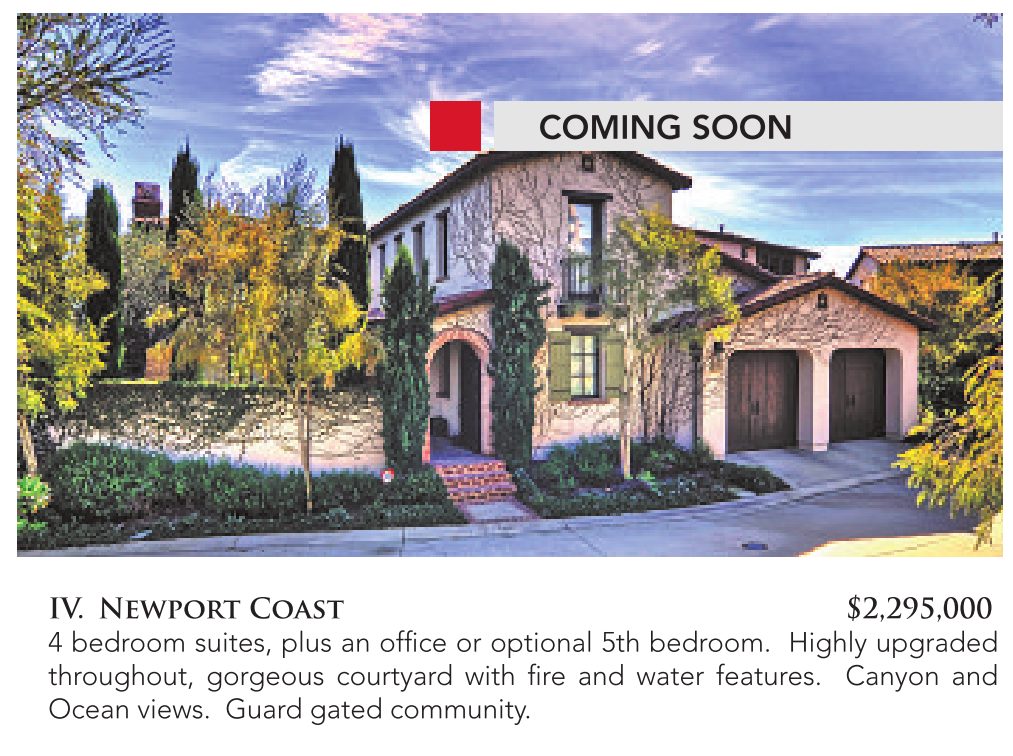 IV. Newport Coast $2,295,000 4 bedroom suites, plus an office or optional 5th bedroom. Highly upgraded throughout, gorgeous courtyard with fire and water features. Canyon and Ocean views. Guard gated community.