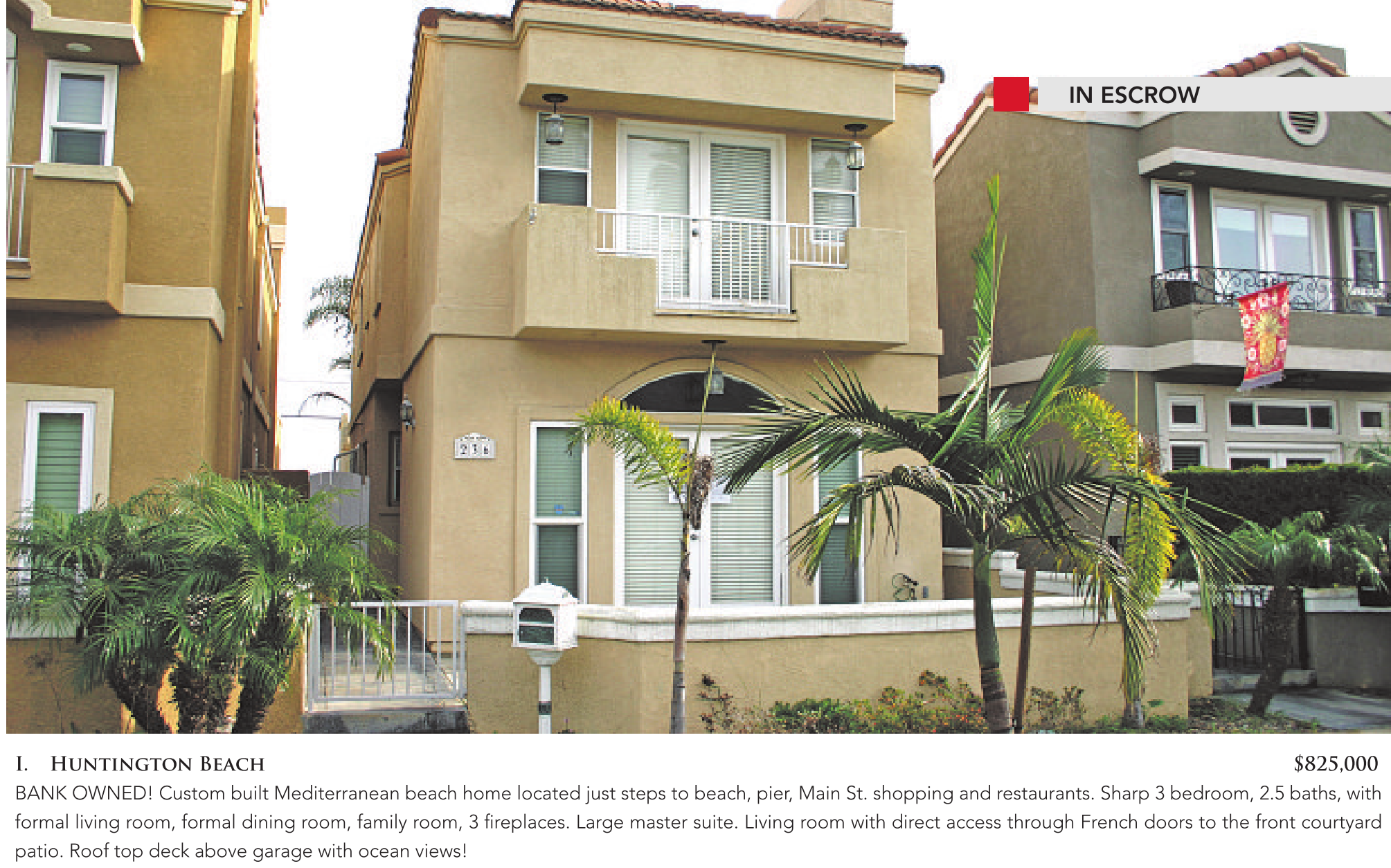 IN ESCROW I. Huntington Beach $825,000 BANK OWNED! Custom built Mediterranean beach home located just steps to beach, pier, Main St. shopping and restaurants. Sharp 3 bedroom, 2.5 baths, with formal living room, formal dining room, family room, 3 fireplaces. Large master suite. Living room with direct access through French doors to the front courtyard patio. Roof top deck above garage with ocean views! See also