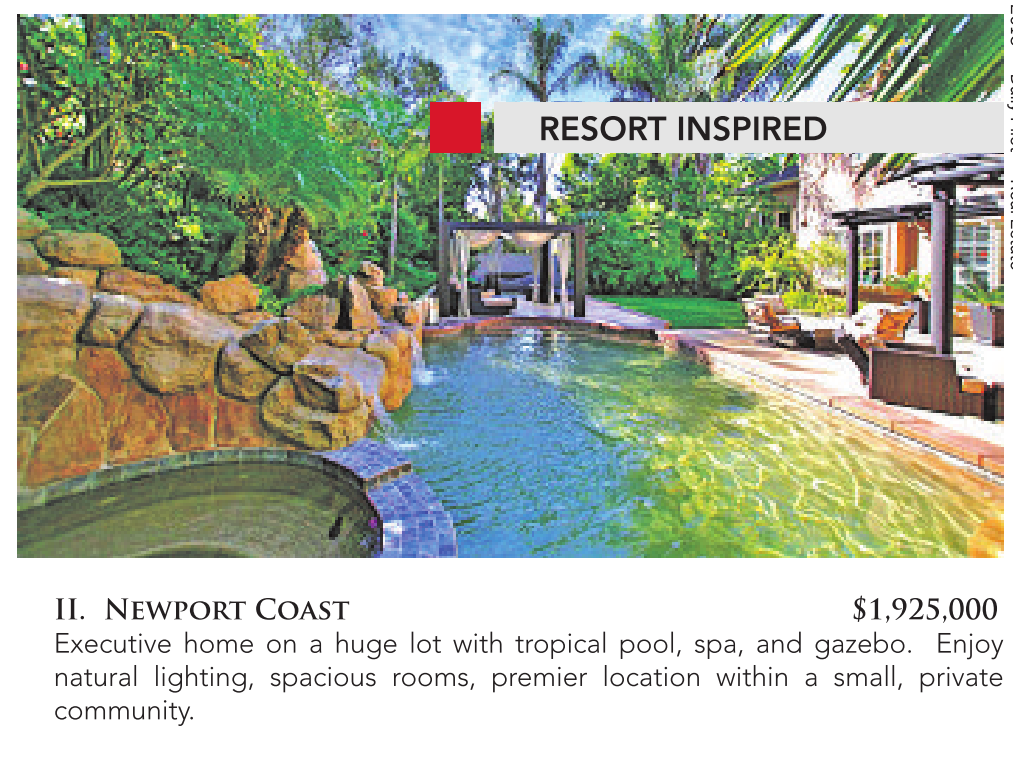 II. Newport Coast $1,925,000 Executive home on a huge lot with tropical pool, spa, and gazebo. Enjoy natural lighting, spacious rooms, premier location within a small, private community.