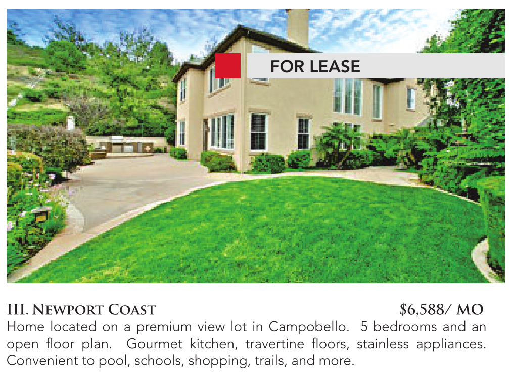 III. Newport Coast $6,588/ MO Home located on a premium view lot in Campobello. 5 bedrooms and an open floor plan. Gourmet kitchen, travertine floors, stainless appliances. Convenient to pool, schools, shopping, trails, and more.