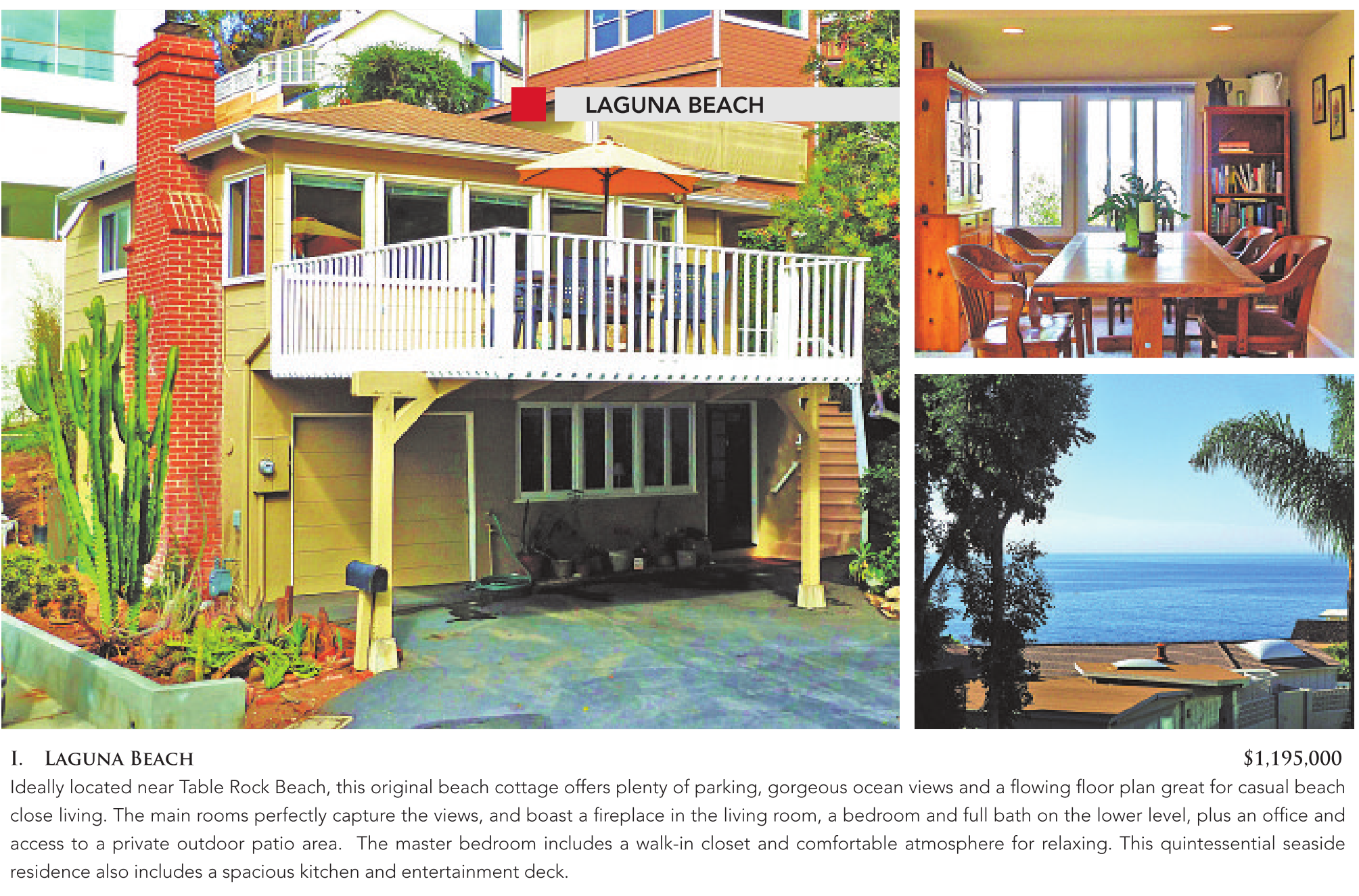 I. Laguna Beach $1,195,000 Ideally located near Table Rock Beach, this original beach cottage offers plenty of parking, gorgeous ocean views and a flowing floor plan great for casual beach close living. The main rooms perfectly capture the views, and boast a fireplace in the living room, a bedroom and full bath on the lower level, plus an office and access to a private outdoor patio area. The master bedroom includes a walk-in closet and comfortable atmosphere for relaxing. This quintessential seaside residence also includes a spacious kitchen and entertainment deck.
