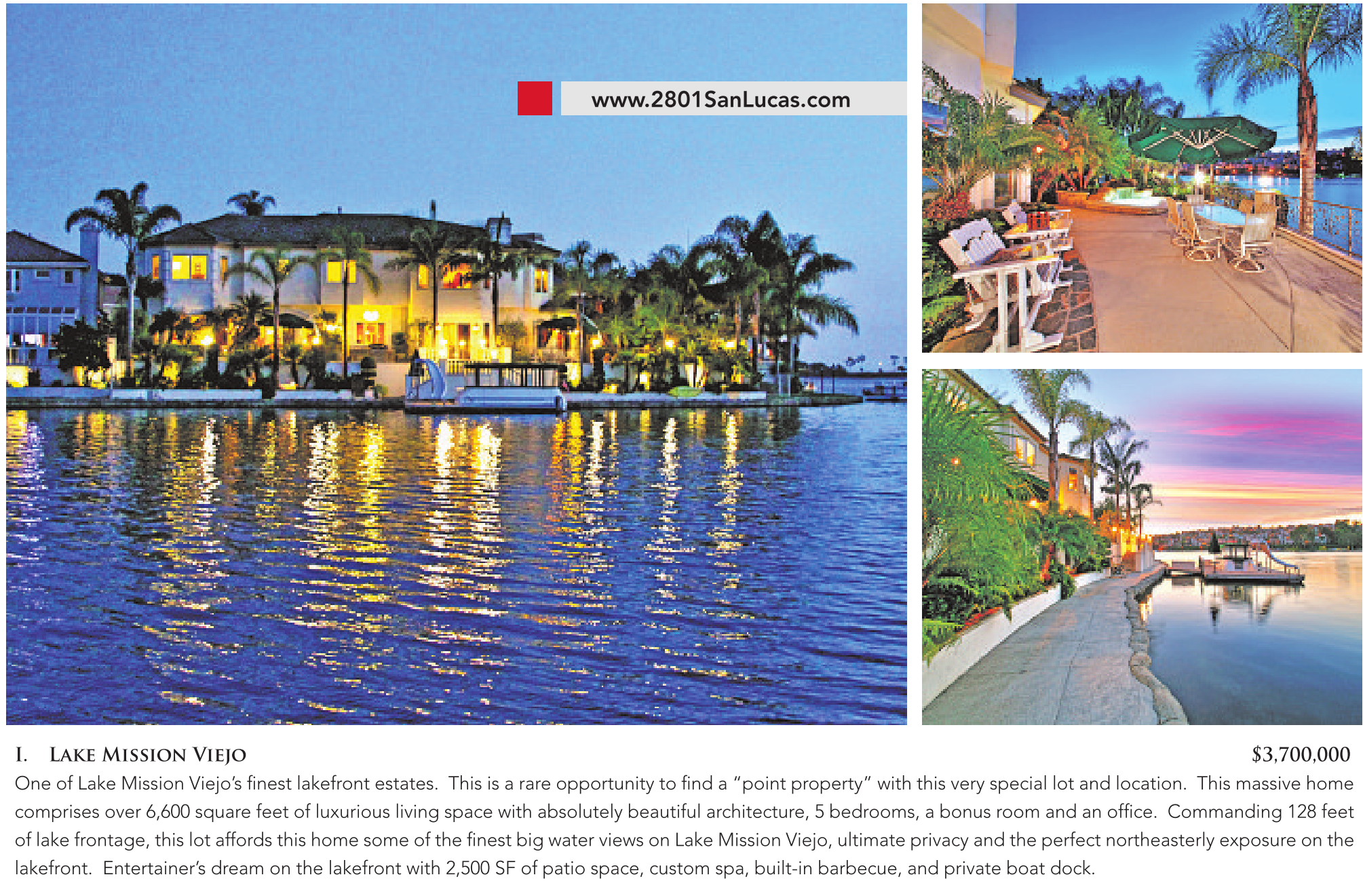 www.2801SanLucas.com I. Lake Mission Viejo $3,700,000 One of Lake Mission Viejo’s finest lakefront estates. This is a rare opportunity to find a “point property” with this very special lot and location. This massive home comprises over 6,600 square feet of luxurious living space with absolutely beautiful architecture, 5 bedrooms, a bonus room and an office. Commanding 128 feet of lake frontage, this lot affords this home some of the finest big water views on Lake Mission Viejo, ultimate privacy and the perfect northeasterly exposure on the lakefront. Entertainer’s dream on the lakefront with 2,500 SF of patio space, custom spa, built-in barbecue, and private boat dock.