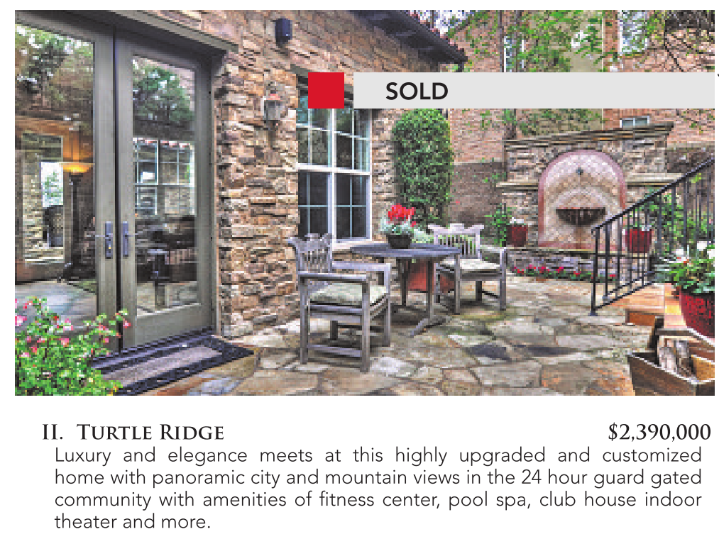 SOLD II. Turtle Ridge $2,390,000 Luxury and elegance meets at this highly upgraded and customized home with panoramic city and mountain views in the 24 hour guard gated community with amenities of fitness center, pool spa, club house indoor theater and more.