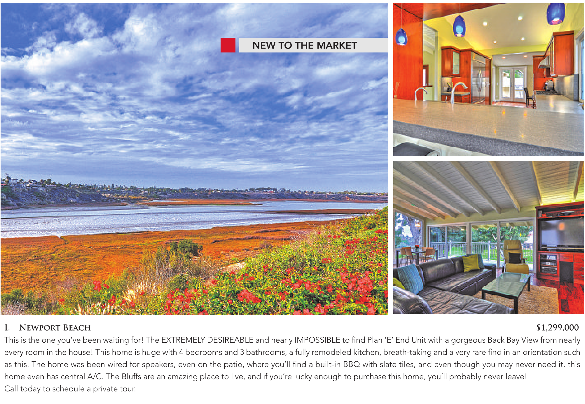 NEW TO THE MARKET I. Newport Beach $1,299,000 This is the one you’ve been waiting for! The EXTREMELY DESIREABLE and nearly IMPOSSIBLE to find Plan ‘E’ End Unit with a gorgeous Back Bay View from nearly every room in the house! This home is huge with 4 bedrooms and 3 bathrooms, a fully remodeled kitchen, breath-taking and a very rare find in an orientation such as this. The home was been wired for speakers, even on the patio, where you’ll find a built-in BBQ with slate tiles, and even though you may never need it, this home even has central A/C. The Bluffs are an amazing place to live, and if you’re lucky enough to purchase this home, you’ll probably never leave! Call today to schedule a private tour.