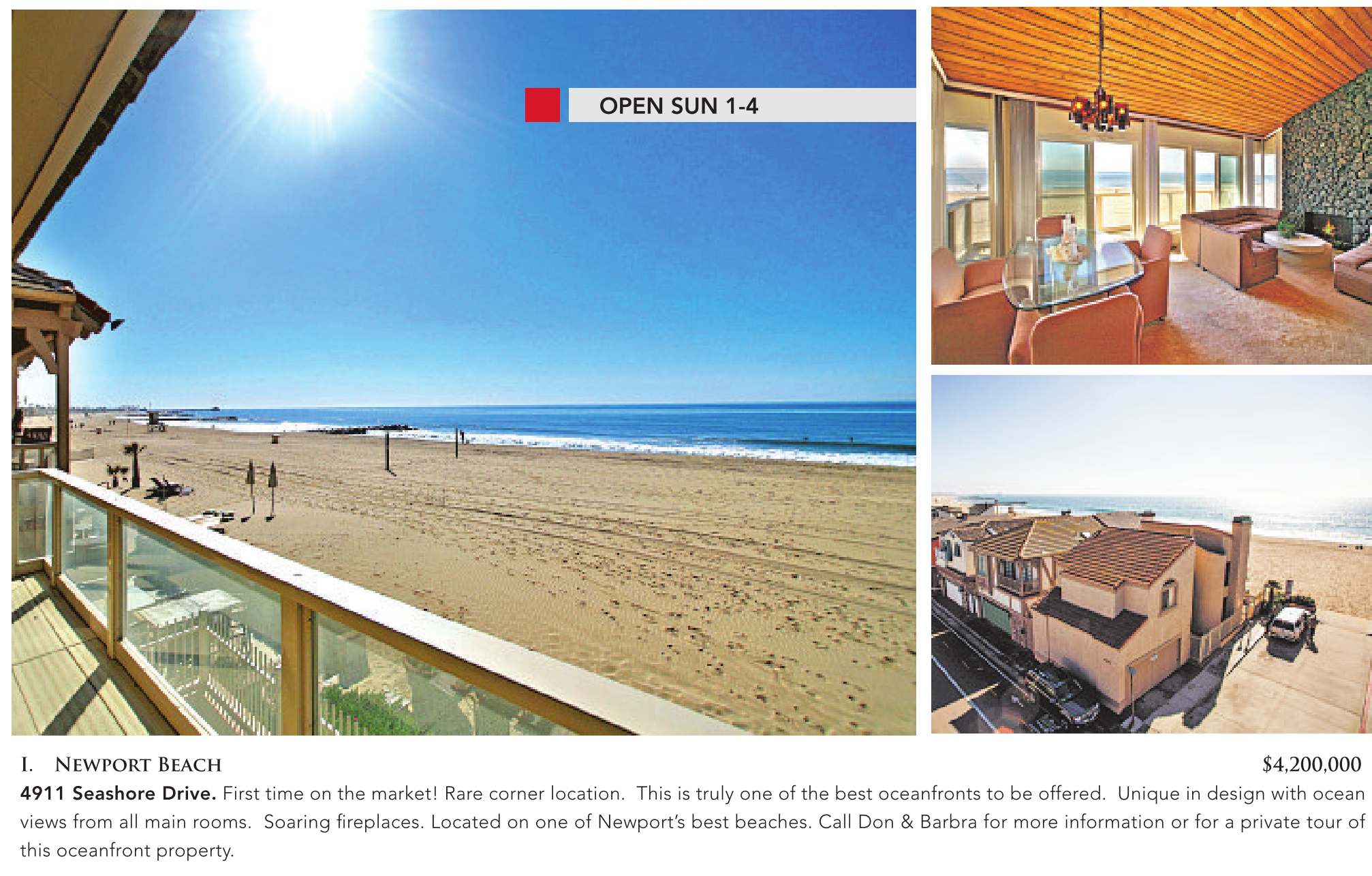 I. Newport Beach $4,200,000 4911 Seashore Drive. First time on the market! Rare corner location. This is truly one of the best oceanfronts to be offered. Unique in design with ocean views from all main rooms. Soaring fireplaces. Located on one of Newport’s best beaches. Call Don & Barbra for more information or for a private tour of this oceanfront property.