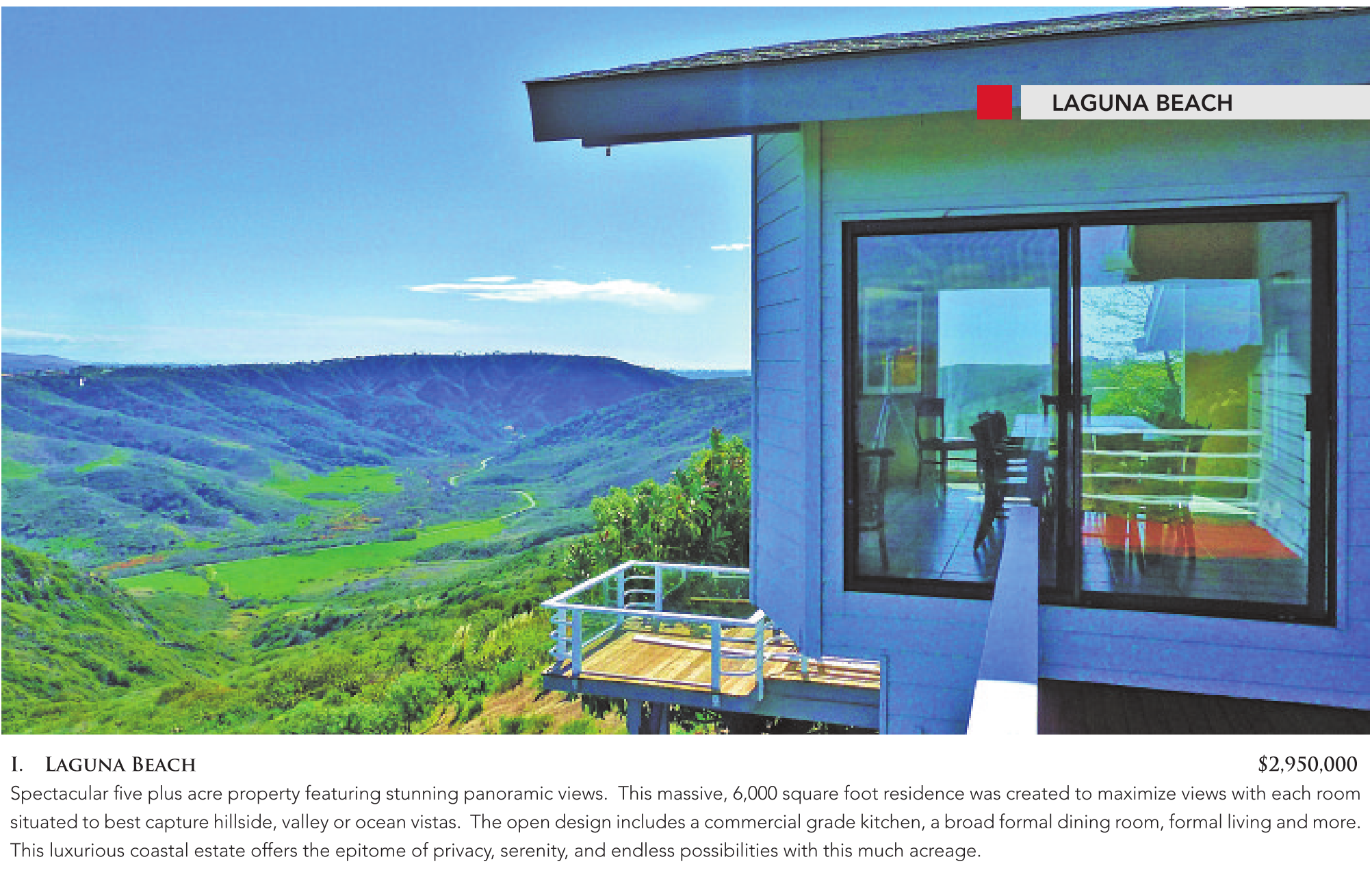 LAGUNA BEACH I. Laguna Beach $2,950,000 Spectacular five plus acre property featuring stunning panoramic views. This massive, 6,000 square foot residence was created to maximize views with each room situated to best capture hillside, valley or ocean vistas. The open design includes a commercial grade kitchen, a broad formal dining room, formal living and more. This luxurious coastal estate offers the epitome of privacy, serenity, and endless possibilities with this much acreage. See also