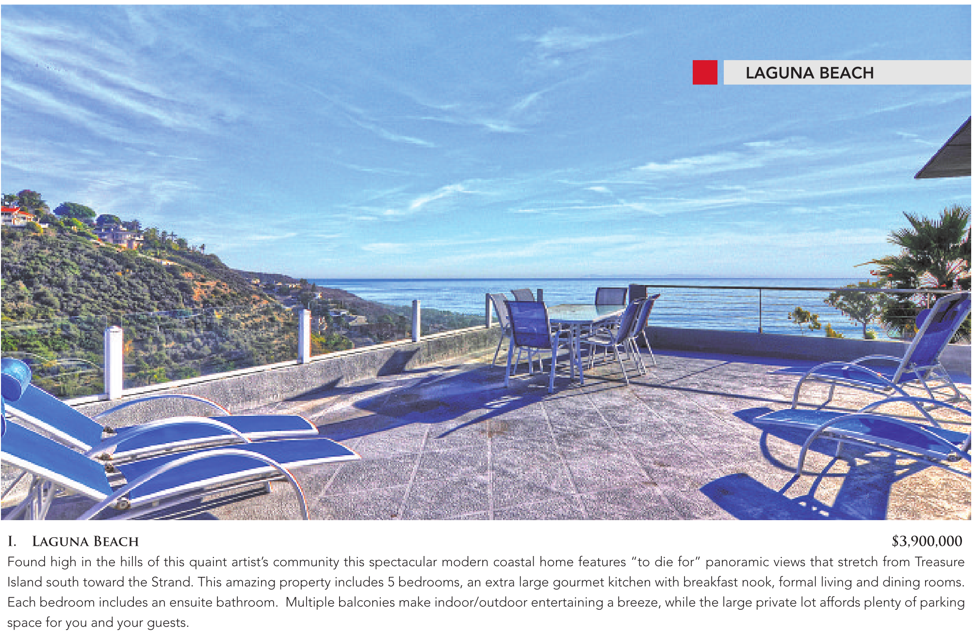 LAGUNA BEACH I. Laguna Beach $3,900,000 Found high in the hills of this quaint artist’s community this spectacular modern coastal home features “to die for” panoramic views that stretch from Treasure Island south toward the Strand. This amazing property includes 5 bedrooms, an extra large gourmet kitchen with breakfast nook, formal living and dining rooms. Each bedroom includes an ensuite bathroom. Multiple balconies make indoor/outdoor entertaining a breeze, while the large private lot affords plenty of parking space for you and your guests. See also