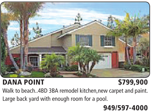 DANA POINT $799,900 Walk to beach..4BD 3BAremodel kitchen,new carpet and paint. Large back yard with enough room for apool.