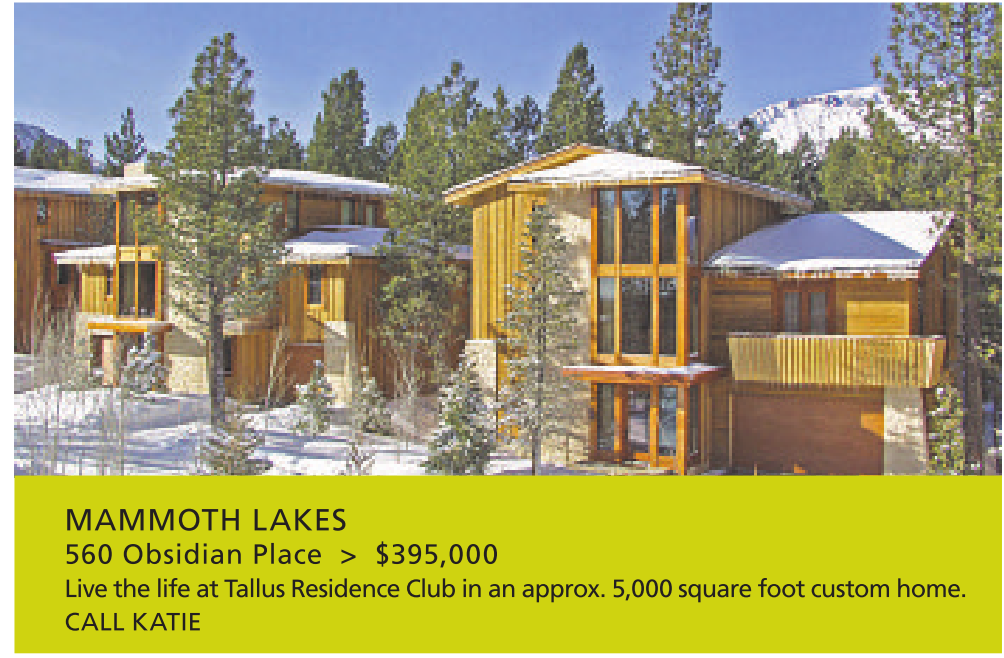 MAMMOTH LAKES 560 Obsidian Place > $395,000 Livethe life at TallusResidenceClubinanapprox.5,000 squarefootcustomhome. CALL KATIE