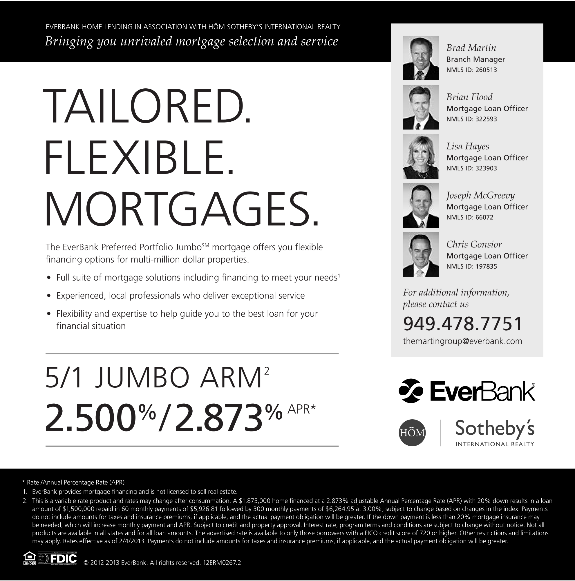 * Rate /Annual Percentage Rate (APR) 1. EverBank provides mortgage financing and is not licensed to sell real estate. 2. this is a variable rate product and rates may change after consummation. A $1,875,000 home financed at a 2.873% adjustable Annual Percentage Rate (APR) with 20% down results in a loan amount of $1,500,000 repaid in 60 monthly payments of $5,926.81 followed by 300 monthly payments of $6,264.95 at 3.00%, subject to change based on changes in the index. Payments do not include amounts for taxes and insurance premiums, if applicable, and the actual payment obligation will be greater. if the down payment is less than 20% mortgage insurance may be needed, which will increase monthly payment and APR. subject to credit and property approval. interest rate, program terms and conditions are subject to change without notice. not all products are available in all states and for all loan amounts. the advertised rate is available to only those borrowers with a Fico credit score of 720 or higher. other restrictions and limitations may apply. Rates effective as of 2/4/2013. Payments do not include amounts for taxes and insurance premiums, if applicable, and the actual payment obligation will be greater.