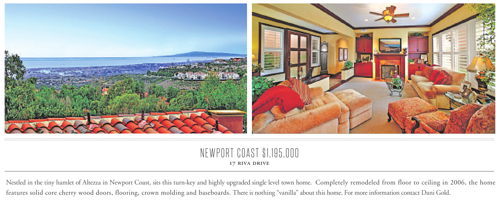 NEWPORT COAST $1,195,000 17 riva drive Nestled in the tiny hamlet of Altezza in Newport Coast, sits this turn-key and highly upgraded single level town home. Completely remodeled from floor to ceiling in 2006, the home features solid core cherry wood doors, flooring, crown molding and baseboards. There is nothing “vanilla” about this home. For more information contact Dani Gold.