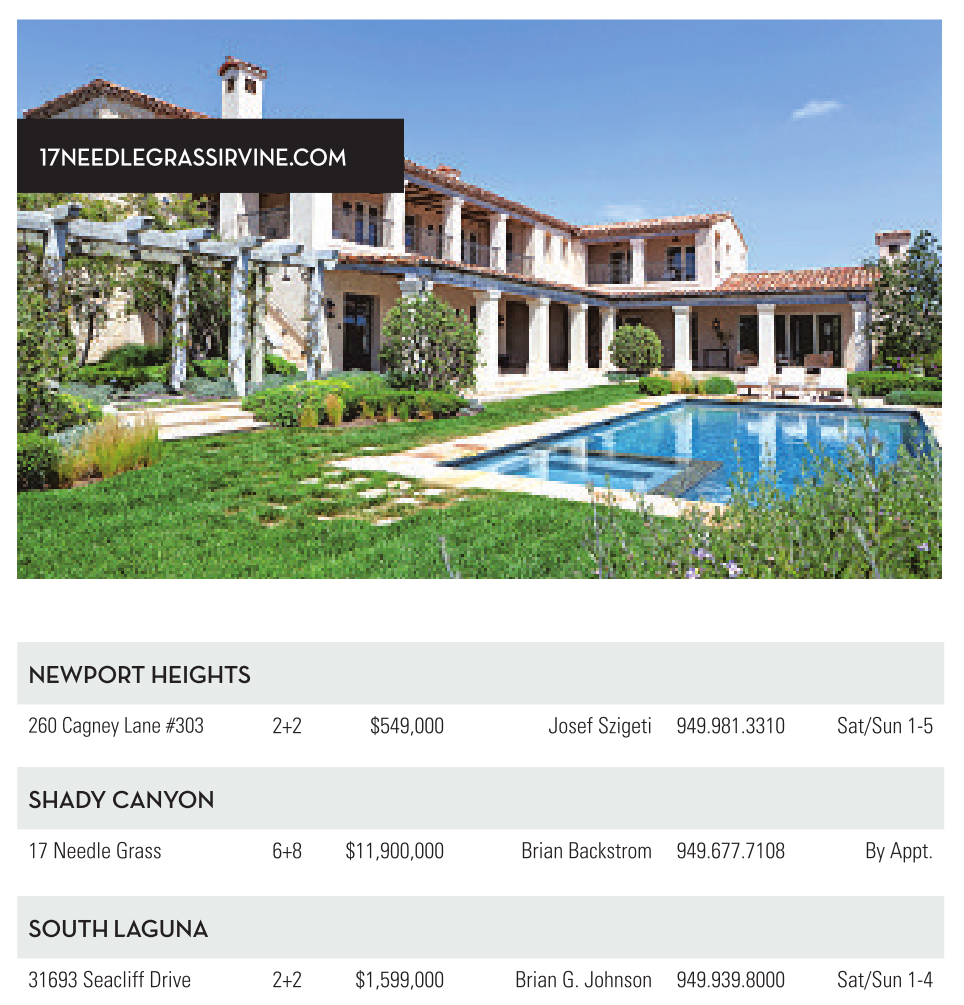 17needlegrassirvine.com newportheights 260 Cagney Lane #303 2+2 $549,000 Josef Szigeti 949.981.3310 Sat/Sun 1-5 shAdycAnyon 17 Needle Grass 6+8 $11,900,000 Brian Backstrom 949.677.7108 By Appt. south lagunA 31693 Seacliff Drive 2+2 $1,599,000 Brian G. Johnson 949.939.8000 Sat/Sun 1-4