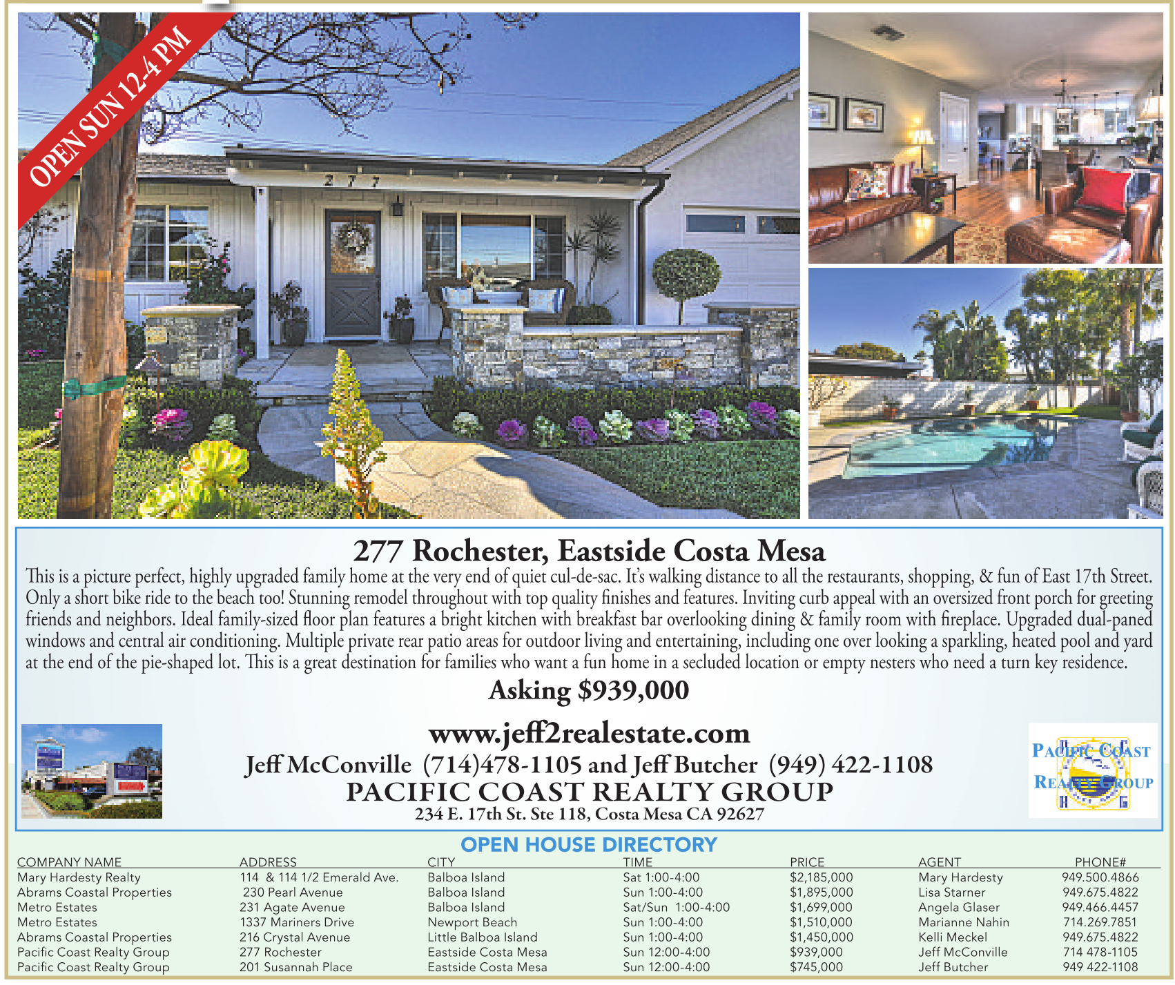 277 Rochester, Eastside Costa Mesa This is a picture perfect, highly upgraded family home at the very end of quiet cul-de-sac. It’s walking distance to all the restaurants, shopping, & fun of East 17th Street. Only ashortbike ride to the beach too! Stunning remodel throughout with top quality finishes and features. Inviting curb appeal with an oversized front porch for greeting friends and neighbors. Ideal family-sized floor plan features a bright kitchen with breakfast bar overlooking dining & family room with fireplace. Upgraded dual-paned windows and central air conditioning. Multiple private rear patio areas for outdoor living and entertaining, including one over looking a sparkling, heated pool and yard at the end of the pie-shaped lot. This is a great destination for families who want a fun home in a secluded location or empty nesters who need a turn key residence. Asking $939,000 www.jeff2realestate.com Jeff McConville (714)478-1105 and Jeff Butcher (949) 422-1108 PACIFIC COAST REALTY GROUP 234 E. 17thSt. Ste118, Costa Mesa CA 92627 PACIFIC COAST REALTY GROUP OPEN HOUSE DIRECTORY COMPANY NAME ADDRESS CITY TIME PRICE AGENT PHONE# Mary Hardesty Realty 114 & 1141/2 Emerald Ave. Balboa Island Sat 1:00-4:00 $2,185,000 Mary Hardesty 949.500.4866 Abrams Coastal Properties 230 Pearl Avenue Balboa Island Sun 1:00-4:00 $1,895,000 Lisa Starner 949.675.4822 Metro Estates 231 Agate Avenue Balboa Island Sat/Sun 1:00-4:00 $1,699,000 Angela Glaser 949.466.4457 Metro Estates 1337 Mariners Drive Newport Beach Sun 1:00-4:00 $1,510,000 Marianne Nahin 714.269.7851 Abrams Coastal Properties 216 Crystal Avenue Little Balboa Island Sun 1:00-4:00 $1,450,000 Kelli Meckel 949.675.4822 Pacific Coast Realty Group 277 Rochester Eastside Costa Mesa Sun 12:00-4:00 $939,000 Jeff McConville 714 478-1105 Pacific Coast Realty Group 201 Susannah Place Eastside Costa Mesa Sun 12:00-4:00 $745,000 Jeff Butcher 949 422-1108