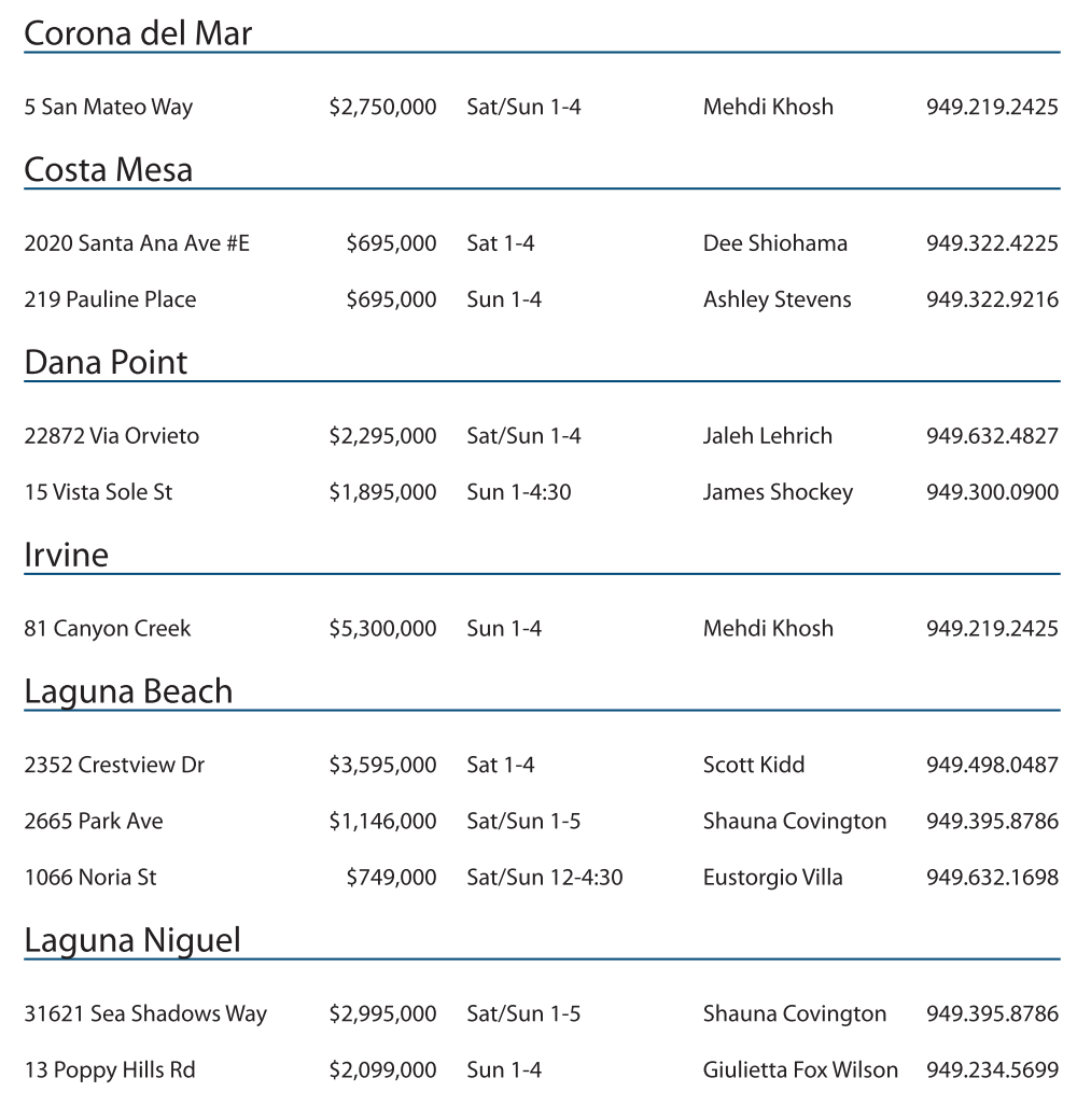 15 Vista Sole St $1,895,000 Sun 1-4:30 James Shockey 949.300.0900