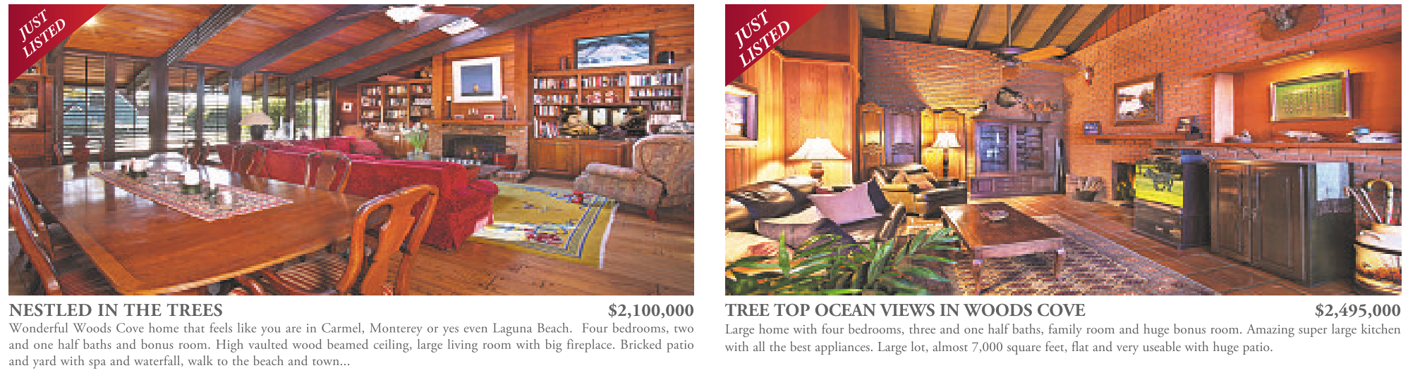 NESTLED IN THE TREES $2,100,000 Wonderful Woods Cove home that feels like you are in Carmel, Monterey or yes even Laguna Beach. Four bedrooms, two and one half baths and bonus room. High vaulted wood beamed ceiling, large living room with big fireplace. Bricked patio and yard with spa and waterfall, walk to the beach and town... TREE TOP OCEAN VIEWS IN WOODS COVE $2,495,000 Large home with four bedrooms, three and one half baths, family room and huge bonus room. Amazing super large kitchen with all the best appliances. Large lot, almost 7,000 square feet, flat and very useable with huge patio.