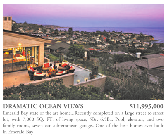 DRAMATIC OCEAN VIEWS $11,995,000 Emerald Bay state of the art home...Recently completed on a large street to street lot, with 7,000 SQ. FT. of living space, 5Br, 6.5Ba. Pool, elevator, and two family rooms, seven car subterranean garage...One of the best homes ever built in Emerald Bay.