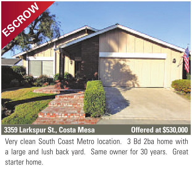 3359 Larkspur St., Costa Mesa Offered at $530,000 Very clean South Coast Metro location. 3 Bd 2ba home with a large and lush back yard. Same owner for 30 years. Great starter home.