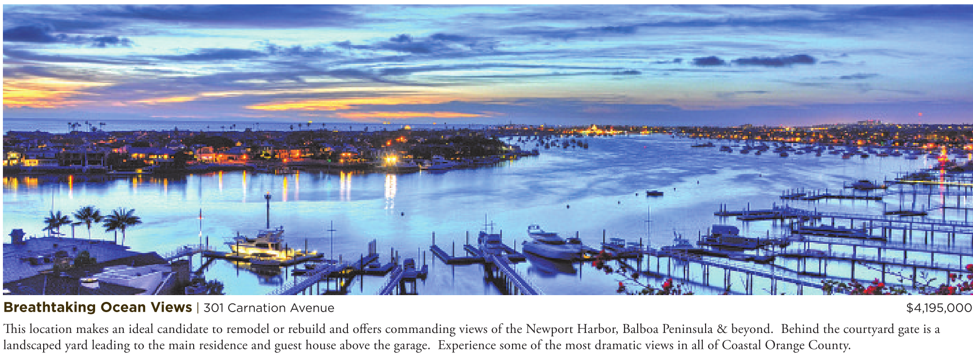 Breathtaking Ocean Views | 301 Carnation Avenue $4,195,000 This location makes an ideal candidate to remodel or rebuild and offers commanding views of the Newport Harbor, Balboa Peninsula & beyond. Behind the courtyard gate is a landscaped yard leading to the main residence and guest house above the garage. Experience some of the most dramatic views in all of Coastal Orange County.
