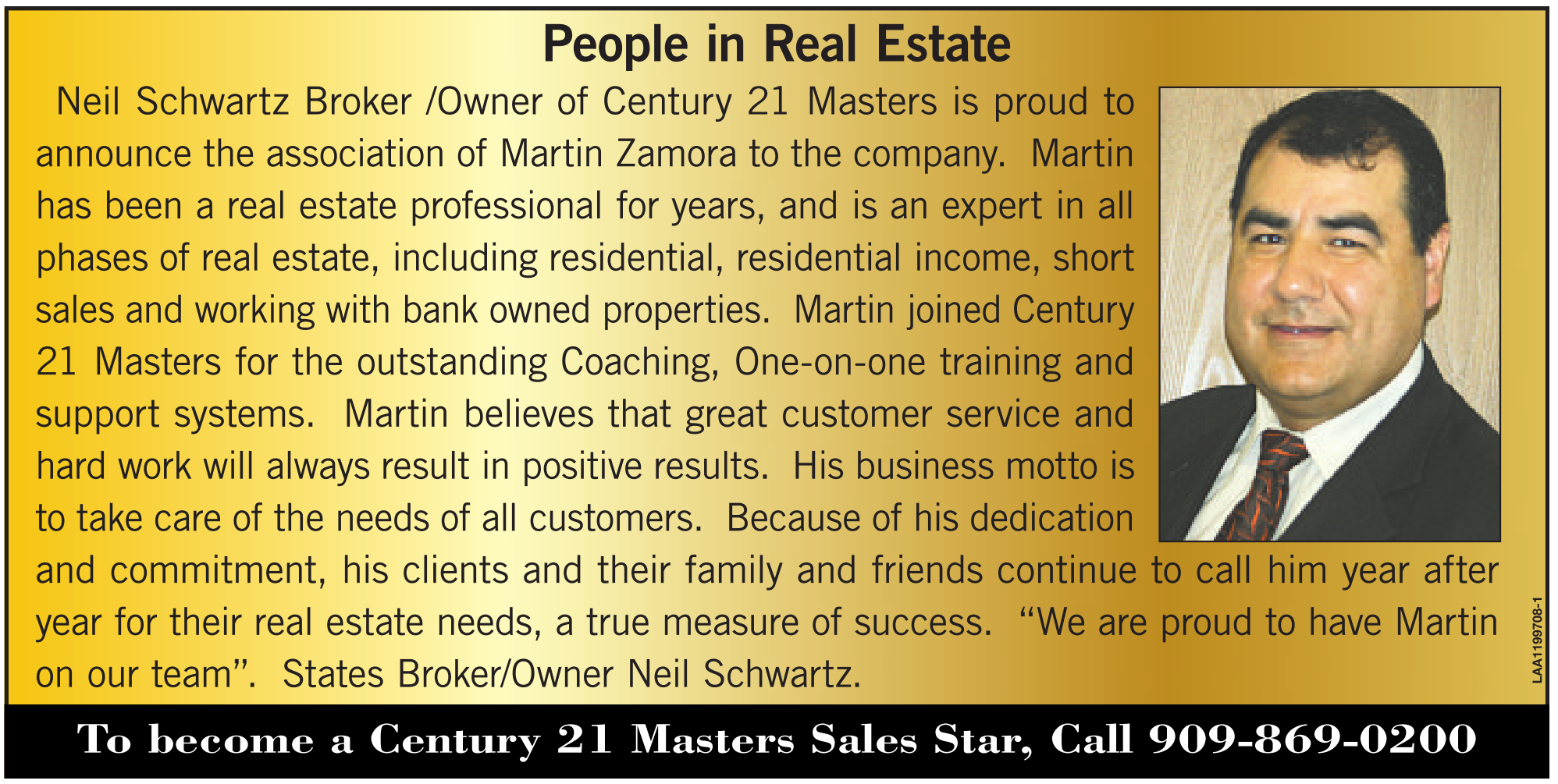 Neil Schwartz Broker /Owner of Century 21 Masters is proud to announce the association of Martin Zamora to the company. Martin has been a real estate professional for years, and is an expert in all phases of real estate, including residential, residential income, short sales and working with bank owned properties. Martin joined Century 21 Masters for the outstanding Coaching, One-on-one training and support systems. Martin believes that great customer service and hard work will always result in positive results. His business motto is to take care of the needs of all customers. Because of his dedication and commitment, his clients and their family and friends continue to call him year after year for their real estate needs, a true measure of success. “We are proud to have Martin on our team”. States Broker/Owner Neil Schwartz.