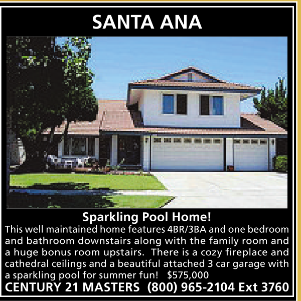 SANTA ANA Sparkling Pool Home! This well maintained home features 4BR/3BAand onebedroom and bathroom downstairs along with the family room and a huge bonus room upstairs. There is a cozy fireplace and cathedral ceilings and abeautiful attached 3car garage with asparkling pool for summer fun! $575,000 CENTURY 21 MASTERS (800) 965-2104 Ext 3760 See also