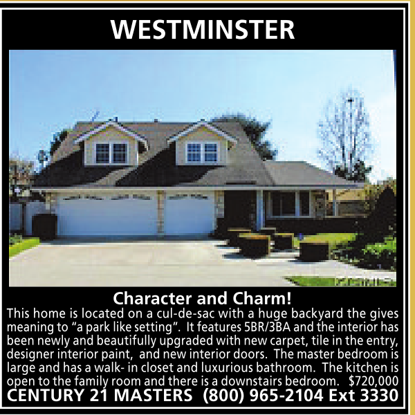 WESTMINSTER Character and Charm! This home is located onacul-de-sac with ahuge backyard the gives meaningto“apark like setting”. It features 5BR/3BA andthe interiorhas been newly andbeautifully upgraded withnew carpet,tileinthe entry, designer interiorpaint, andnew interiordoors. The master bedroom is largeand hasawalk-incloset andluxurious bathroom. Thekitchen is open to thefamilyroomand thereisadownstairsbedroom. $720,000 CENTURY 21 MASTERS (800) 965-2104 Ext 3330