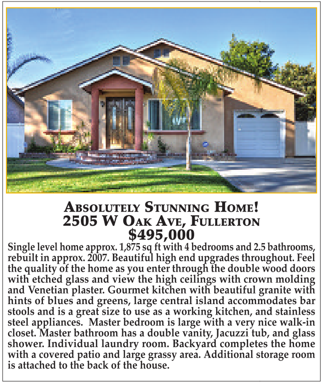 ABSOLUTELY STUNNING HOME! 2505 W OAK AVE, FULLERTON $495,000 Single level home approx. 1,875 sq ft with 4bedrooms and 2.5 bathrooms, rebuilt in approx. 2007. Beautiful high end upgrades throughout. Feel the quality of the home as you enter through the double wood doors with etched glass and view the high ceilings with crown molding and Venetian plaster. Gourmet kitchen with beautiful granite with hints of blues and greens, large central island accommodates bar stools and is a great size to use as a working kitchen, and stainless steel appliances. Master bedroom is large with avery nice walk-in closet. Master bathroom has adouble vanity, Jacuzzi tub, and glass shower. Individual laundry room. Backyard completes the home with acovered patio and large grassy area. Additional storage room is attached to the back of the house.