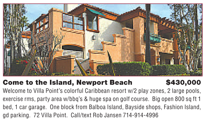 Come to the Island, Newport Beach $430,000 Welcome to Villa Point’s colorful Caribbean resort w/2 play zones, 2large pools, exerciserms, partyareaw/bbq’s &hugespa on golfcourse. Bigopen800 sq ft 1 bed, 1car garage. One block from Balboa Island, Bayside shops, Fashion Island, gd parking. 72 VillaPoint. Call/text RobJansen 714-914-4996