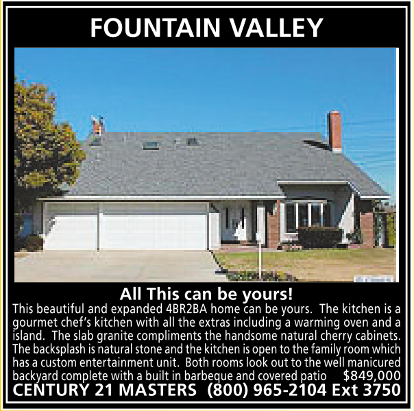 FOUNTAIN VALLEY All This can be yours! This beautiful and expanded 4BR2BA home can be yours. The kitchen is agourmet chef’s kitchen with all the extras including awarming oven and aisland. The slab granite compliments the handsome natural cherry cabinets. Thebacksplashisnatural stone andthe kitchen is open to thefamilyroomwhich has acustom entertainment unit. Both rooms look out to the well manicured backyard complete with abuilt in barbeque and covered patio $849,000 CENTURY 21 MASTERS (800) 965-2104 Ext 3750 See also