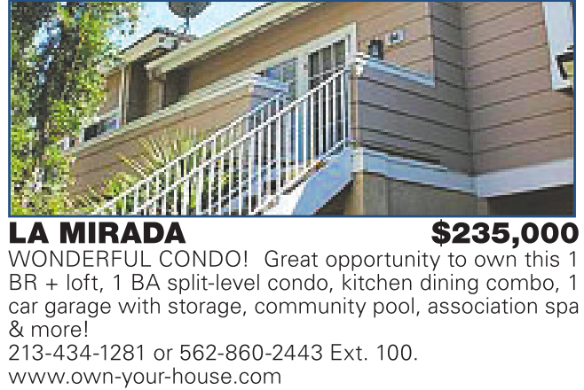 LA MIRADA $235,000 WONDERFUL CONDO! Great opportunity to own this 1BR + loft, 1 BA split-level condo, kitchen dining combo, 1car garage with storage, community pool, association spa & more! 213-434-1281 or 562-860-2443 Ext. 100. www.own-your-house.com