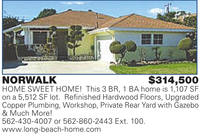 NORWALK $314,500 HOME SWEET HOME! This 3 BR, 1 BA home is 1,107 SF on a 5,512 SF lot. Refinished Hardwood Floors, Upgraded Copper Plumbing, Workshop, Private Rear Yard with Gazebo & Much More! 562-430-4007 or 562-860-2443 Ext. 100. www.long-beach-home.com
