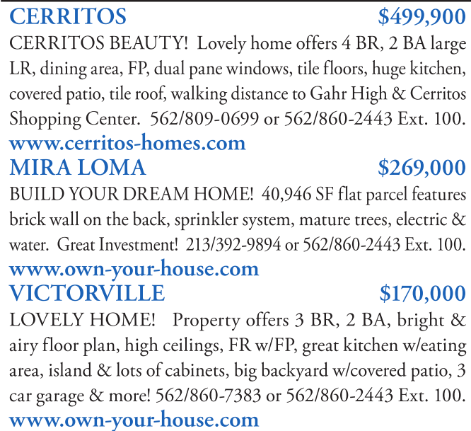 area, island & lots of cabinets, big backyard w/covered patio, 3car garage & more! 562/860-7383 or 562/860-2443 Ext. 100.