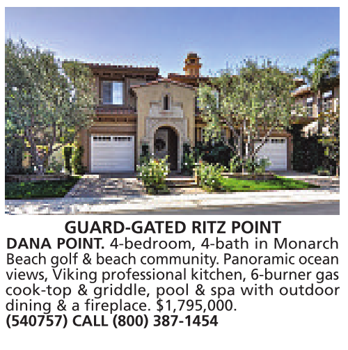 GUARD-GATED RITZ POINT DANA POINT. 4-bedroom, 4-bath in Monarch Beach golf &beach community.Panoramic ocean views, Viking professional kitchen, 6-burner gas cook-top & griddle, pool & spa with outdoor dining & a fireplace. $1,795,000. (540757) CALL (800) 387-1454