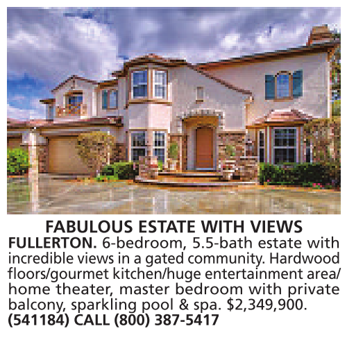 FABULOUS ESTATE WITH VIEWS FULLERTON. 6-bedroom, 5.5-bath estate with incredible views in agated community.Hardwood floors/gourmet kitchen/huge entertainment area/ home theater, master bedroom with private balcony, sparkling pool & spa. $2,349,900. (541184) CALL (800) 387-5417