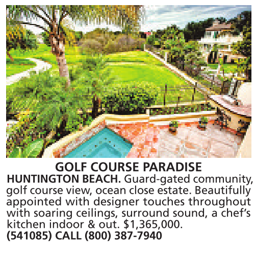 GOLF COURSE PARADISE HUNTINGTON BEACH. Guard-gated community, golf courseview,ocean close estate. Beautifully appointed with designer touches throughout with soaring ceilings, surround sound, a chef’s kitchen indoor & out. $1,365,000. (541085) CALL (800) 387-7940