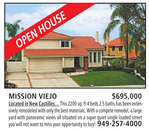 MISSION VIEJO $695,000 LocatedinNew Castilles… This 2200 sq. ft 4beds2.5 bathshas been extensively remodeledwithonlythe bestmaterials.Withacompeteremodel, alarge yard with panoramic views all situated on asuper quiet single loaded street youwill notwant to missyour opportunitytobuy! 949-257-4000